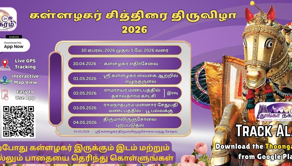 Track Alagar | மதுரை சித்திரை திருவிழா 2026 – கள்ளழகர் இருக்கும் இடம் Live Tracking நேரலை கண்காணிப்பு · 29 ஏப்ரல் – 6 மே 2026 மதுரை சித்திரை திருவிழா 2026-இன் மிகவும் எதிர்பார்க்கப்படும்…