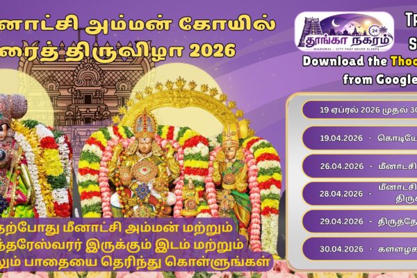 Track Meenakshi Amman – மதுரை சித்திரை திருவிழா 2026 | மீனாட்சி அம்மன் & சுந்தரேஸ்வரர் வீதி உலா Live Tracking நேரலை கண்காணிப்பு · 19–29 ஏப்ரல் 2026 மதுரை சித்திரை திருவிழா 2026-இன் முக்கிய ஆன்மிக நிகழ்வாக, அருள்மிகு மீனாட்சி…