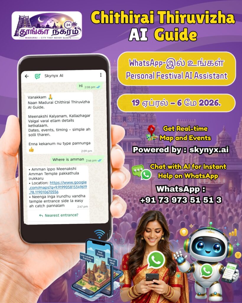 AI உடன் சித்திரை திருவிழா 2026 – Real-Time Updates, இனி Zero Confusion! Chithirai Thiruvizha AI Guide — Skynyx AI AI Guide · 2026 Chithirai Thiruvizha AI Guide…